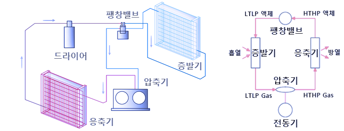 히트펌프는 냉매가 압축·응축·팽창·증발을 반복하며 고온·저온을 만들어 냉방과 난방을 동시에 수행합니다.
